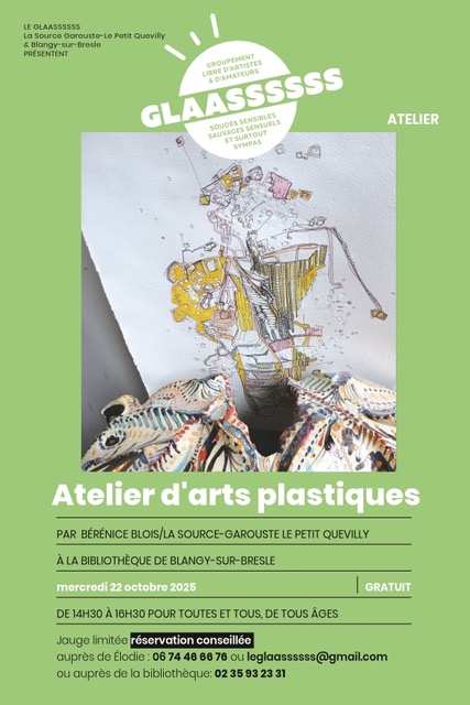 Rejoignez Bérénice lors de l’atelier ouvert à toutes et à tous à la bibliothèque et participez à ses créations. Apportez votre imaginaire et interprétation en usant de techniques variées telle que le papier gaufré, le modelage de l’argile, les pastels gras, encres, stylos, feutres et collages ..
