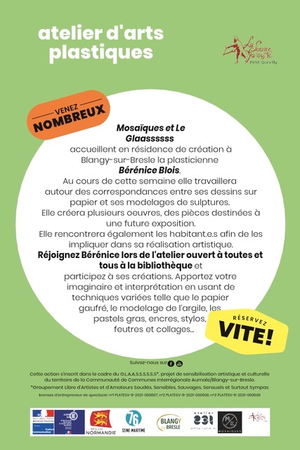 Mosaïques et le Glaassssss accueillent en résidence de création à Blangy-sur-Bresle la plasticienne Bérénice Blois. Au cours de cette semaine elle travaillera autour des correspondances entre ses dessins sur papier et ses modelages de sculptures. Elle créera plusieurs oeuvres, des pièces destinées à une future exposition. Elle rencontrera également les habitants afin de les impliquer dans sa réalisation artistique.