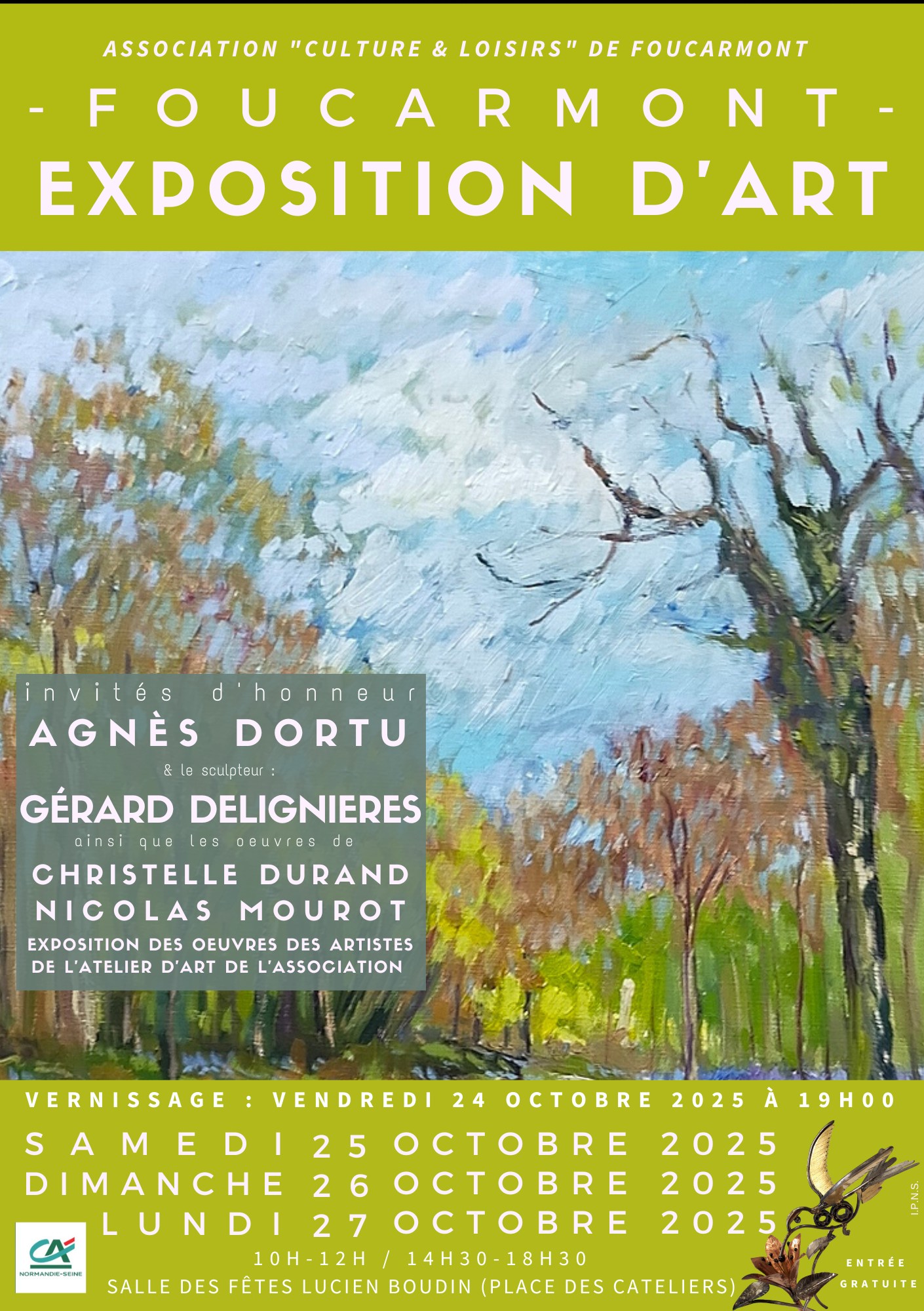 L’association « Culture et loisirs de Foucarmont » vous invite à son exposition d’art qui accueillera en invités d’honneurs les artistes Agnès Dortu, artiste peintre, et Gérard Delignières, sculpteur.