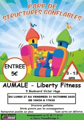 Du lundi 27 au vendredi 31 octobre 2025, viens t’éclater dans le grand parc de structures gonflables installé chez Liberty Fitness, 5 boulevard Victor Hugo – 76390 Aumale