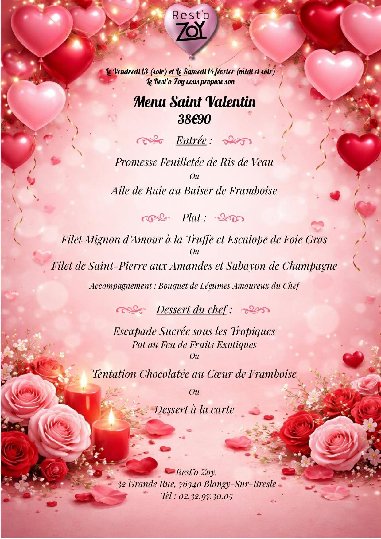 A l’occasion de la Saint Valentin, votre Resto’ ZOY vous propose un menu spécial qui sera servi le vendredi 13 soir et le samedi 14 midi et soir.