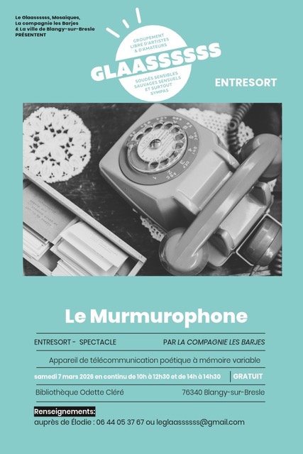 Le murmurophone est un entresort-spectacle. Le principe est simple : vous pouvez écouter des poèmes en composant un numéro sur le cadran d’un vieux téléphone. Chaque numéro correspond à un poème. Rejoignez-vous le samedi 7 mars à la bibliothèque de Blangy pour écouter des poèmes et surtout enregistrer vos préférés. Vous pouvez également téléphoner au 02 35 70 74 66 (avant le 6 mars). Sur la boite vocale enregistrez votre poème puis dites son titre, son auteur, ainsi que votre prénom. Un numéro de téléphone sera attribué à votre mise en voix et elle sera inscrite dans le répertoire. Invitez vos amis à venir vous écouter du 7 au 17 mars à la bibliothèque.