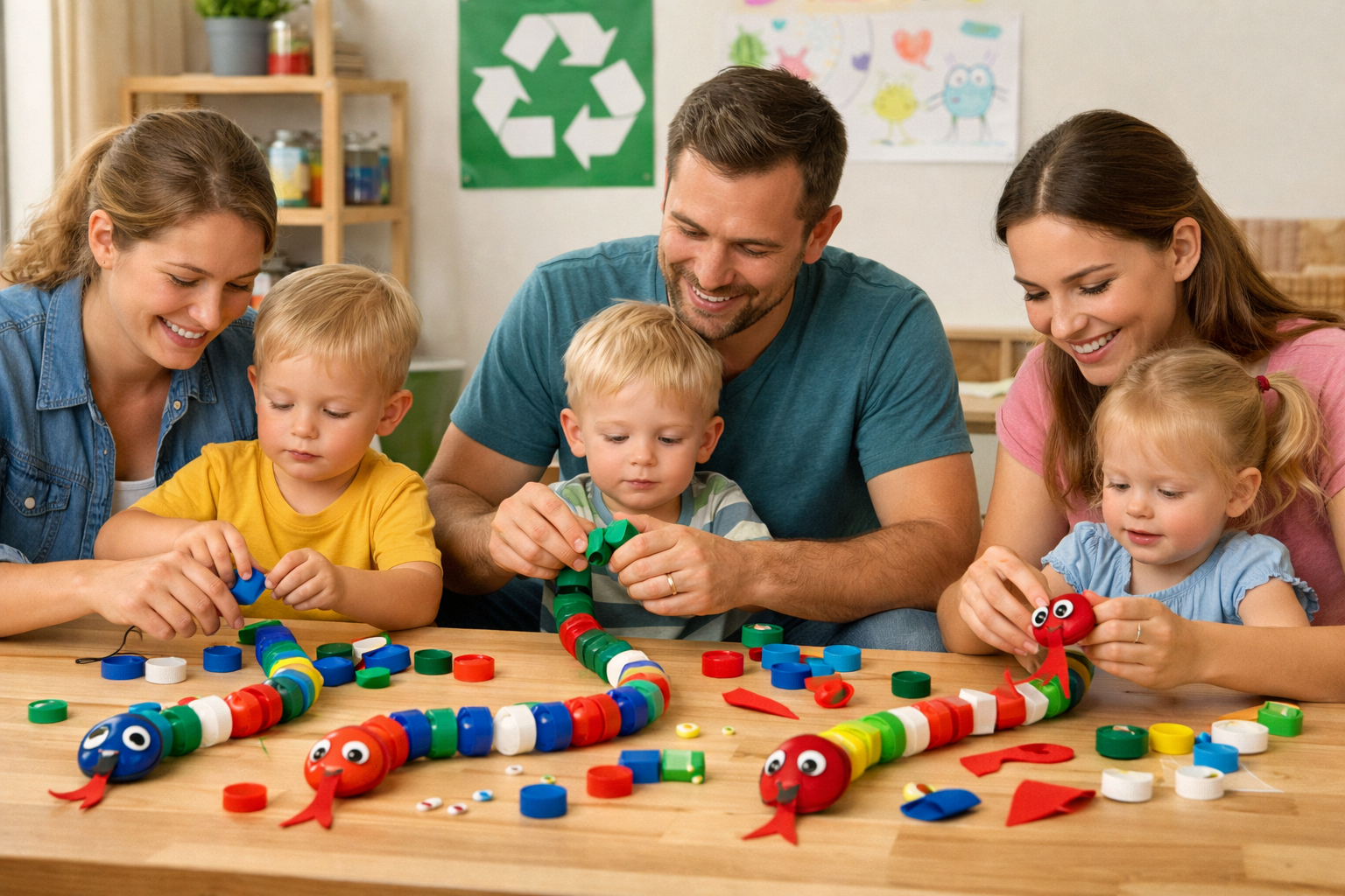 Deux personnages débarquent valises et guitares sous le bras. Le tapis est déroulé et avec lui tout un universde couleurs et de formes. Les objets dansant et créent des paysages, un bonhomme en couvercle, un serpent de bouchon, un oiseau en assiette.