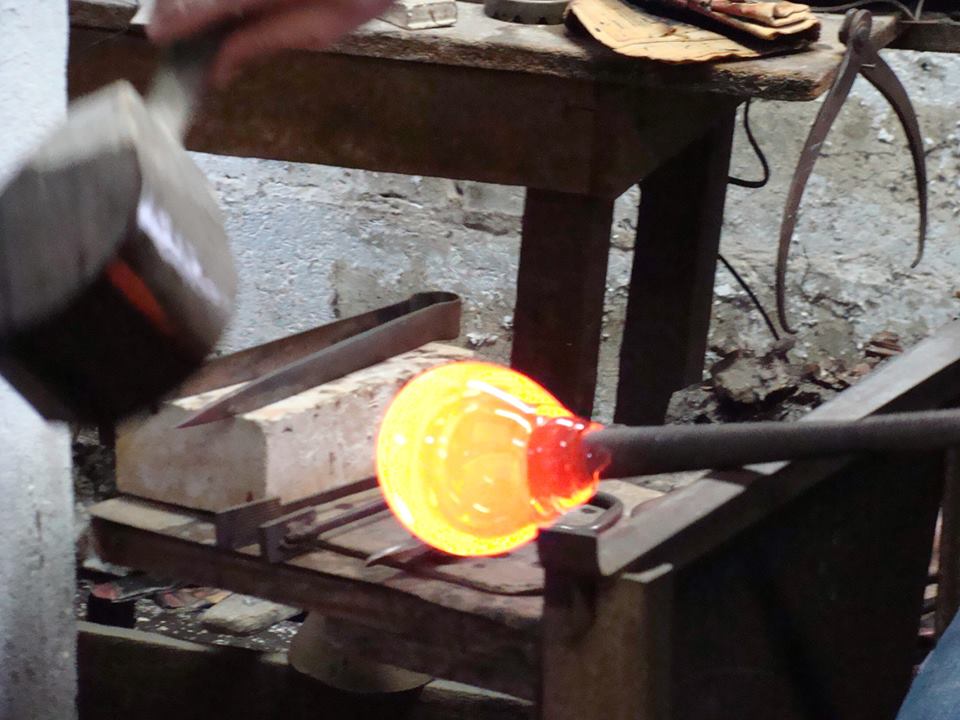 Luigi Dei Rossi cueille la boule incandescente dans son four chauffé à 1200 degrés avant de rouler dans les différents colorants. Cet artiste verrier de Blangy sur Bresle, au nord-est du département de la Seine Maritime, et fils de Vénitien.